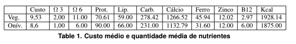 A Tabela 1 apresenta a média de dois dias do custo das dietas vegetariana e onívora, bem como a média da quantidade de nutrientes contidos em cada dieta obtida como solução da nossa implementação. Os 4 primeiros nutrientes estão em gramas, os três seguintes em miligramas e a B12 em micagramas.